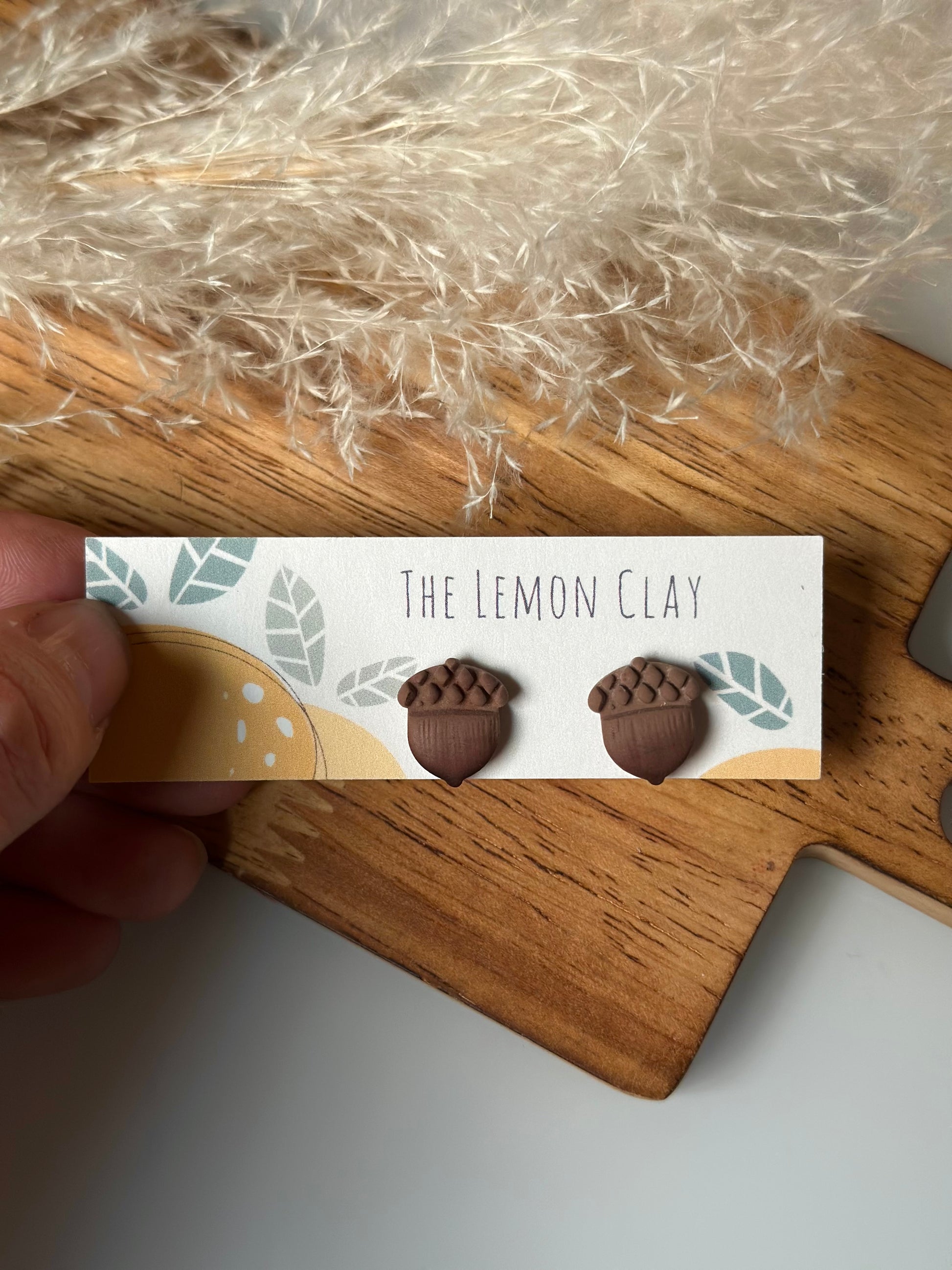 Handmade polymer clay earrings. Acorn studs with hypoallergenic 316L stainless steel studs.