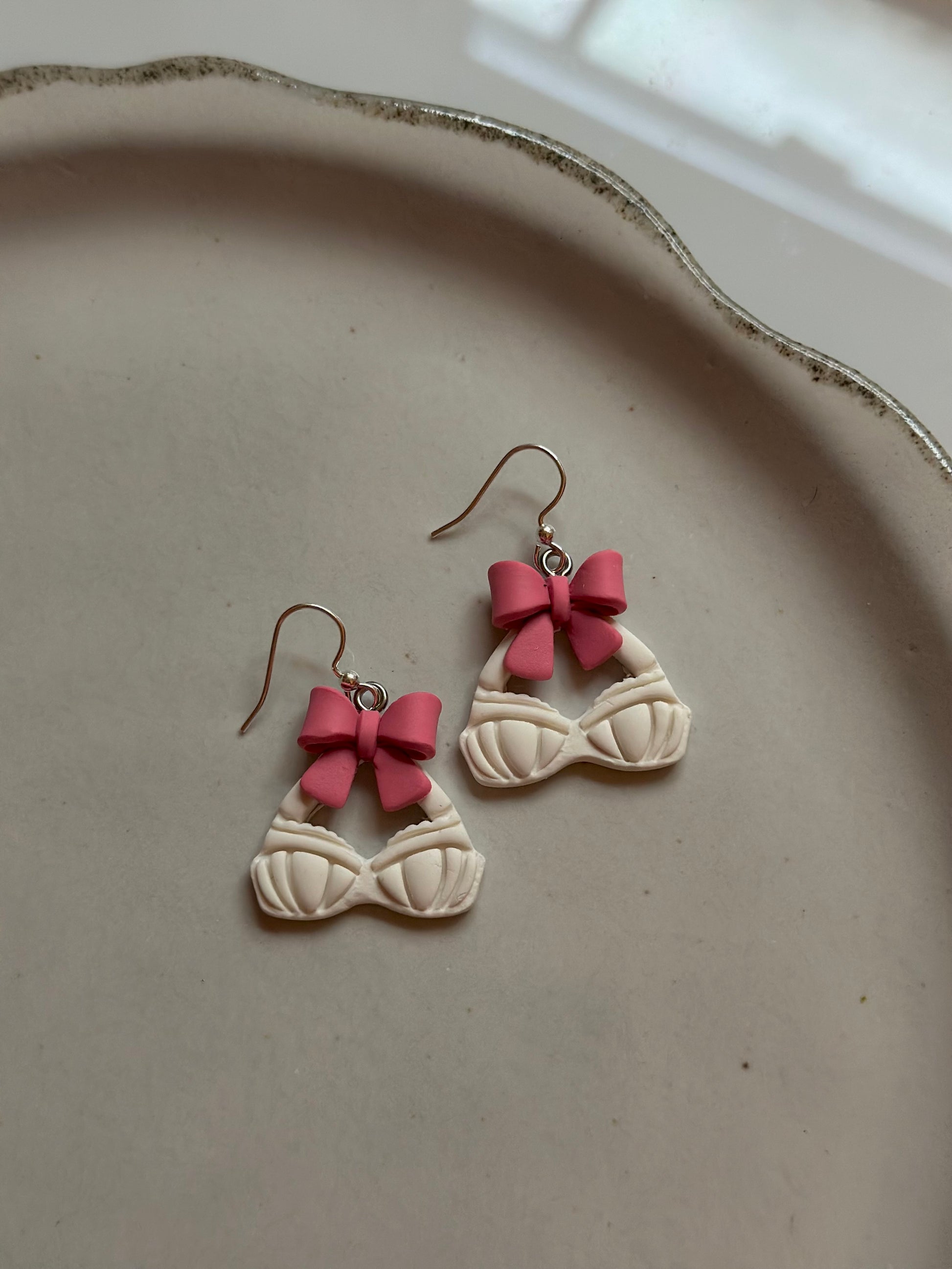 Handcrafted polymer clay jewelry. Pink ribbons on bra dangle earrings finished with hypoallergenic hooks (Real silver or gold plated). Proceeds donated to the Bismarck Cancer Center.