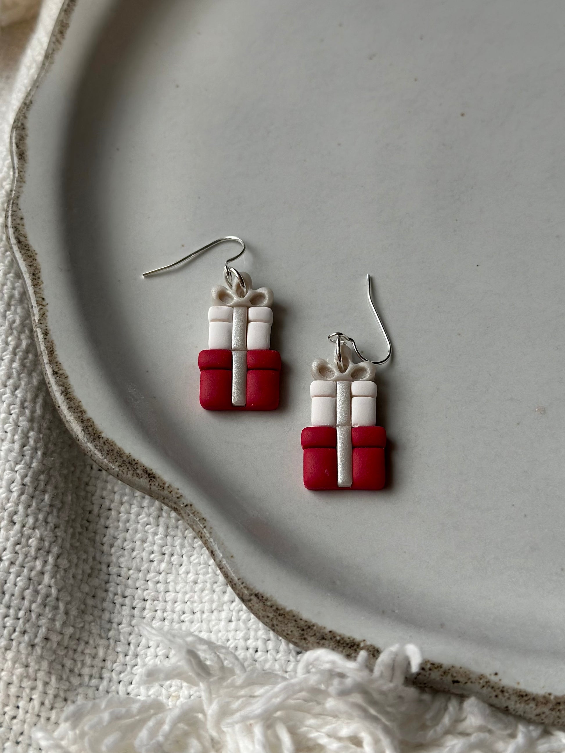 Handcrafted polymer clay jewelry. Red stacked holiday gift dangle earrings finished with hypoallergenic hooks (real gold or silver plating on 316L stainless steel).