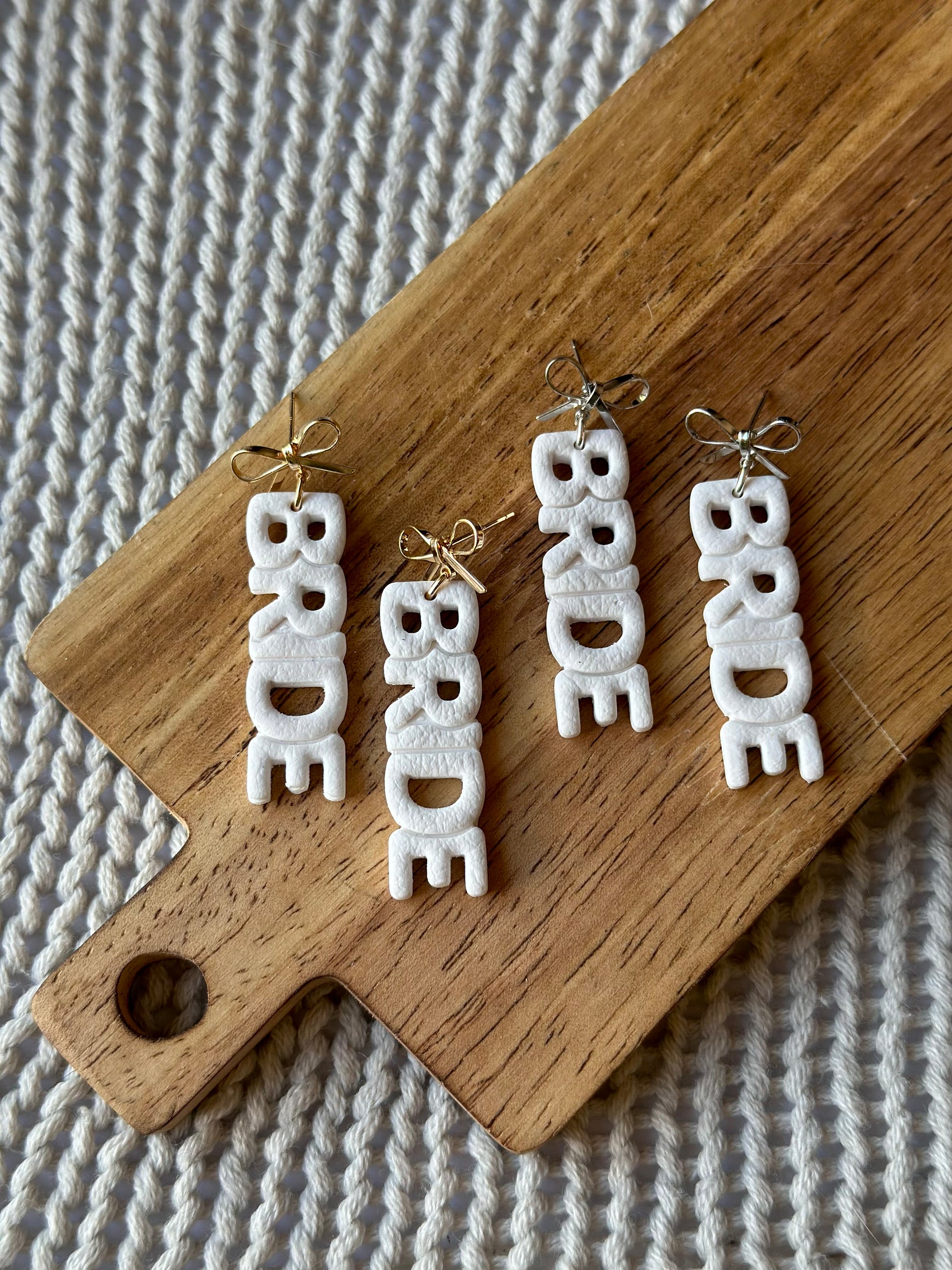 Handmade polymer clay earrings. Bride lettering dange earrings finished with real 24k gold or silver plated hypoallergenic studs.